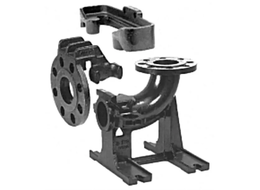 Автоматическая трубная муфта состоит из 3-х частей: основная часть, верхнее крепление направляющих труб и крепление насоса. Основная часть трубной муфты крепится ко дну колодца анкерными болтами.
