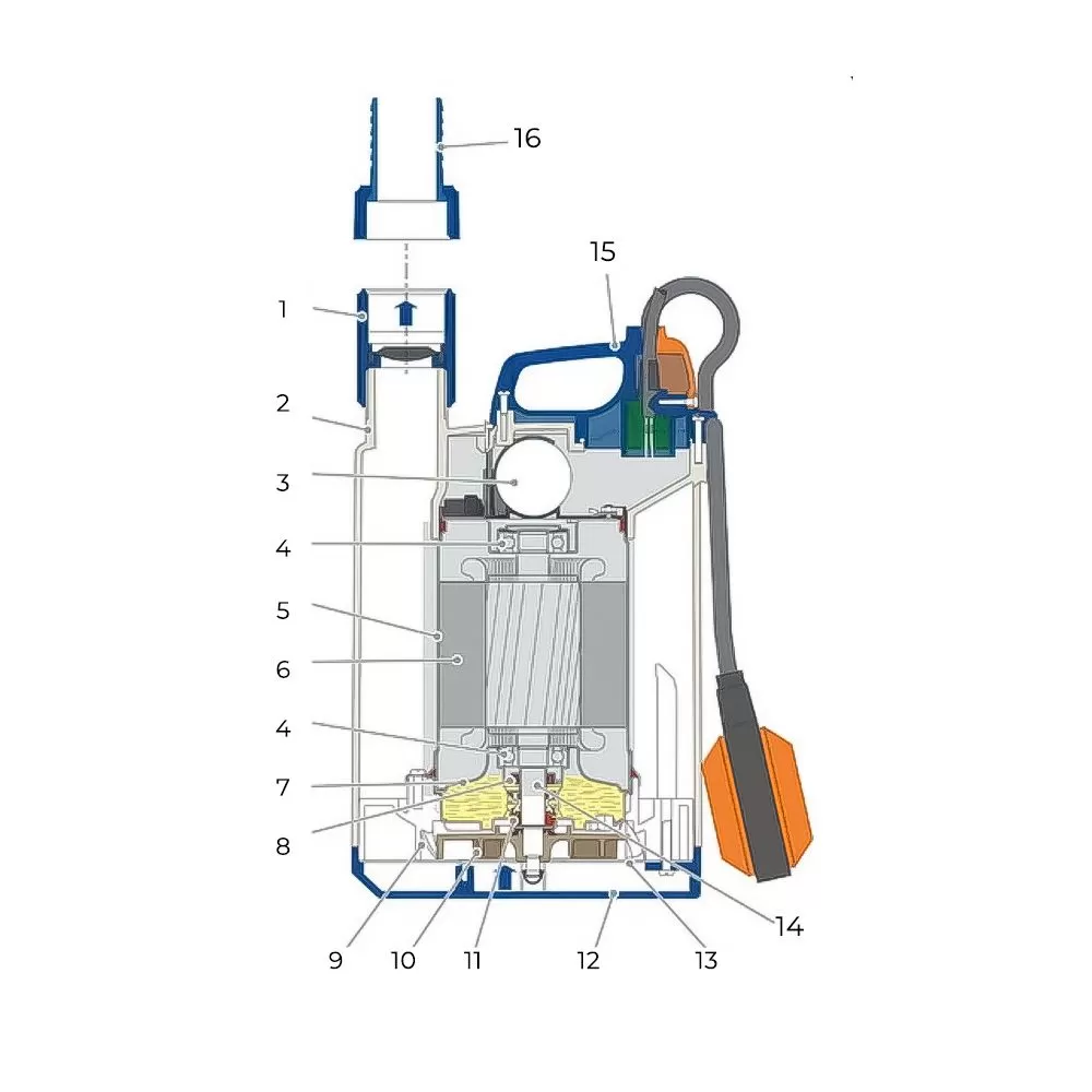 Выходящая из рабочего колеса жидкость направляется в спираль, где происходит преобразование кинетической энергии в энергию напора. Она затем покидает насос через вертикально установленный патрубок подачи, расположенный в нагнетательном корпусе. Важно отметить, что перекачиваемая жидкость также служит охладителем для двигателя насоса. Это обеспечивает необходимое охлаждение и предотвращает перегрев двигателя во время его работы. В целом, серия ТОР представляет собой эффективные и надежные погружные насосы, разработанные специально для использования в системах дренажа. Они обладают автоматической работой, обеспечивают эффективное охлаждение двигателя и способны эффективно перекачивать жидкость в различных условиях.