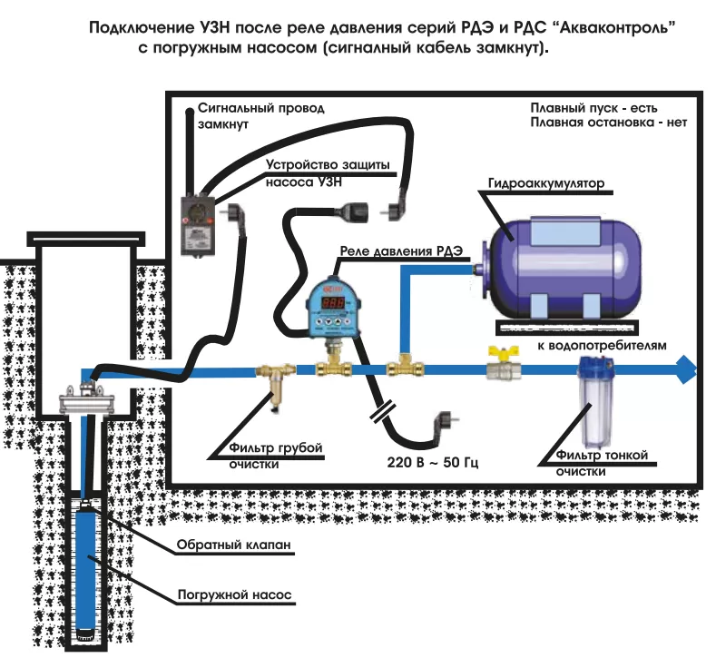 УЗН-1,5П (устройство защиты насоса) предназначено для управления и защиты поверхностных насосов. УЗН обеспечивает плавный пуск и плавную остановку подключенного насоса, а также обеспечивает его защиту от перегрузок по току и напряжению и от сухого хода. УЗН обладает функцией "обучения" характеристикам подключённого насоса, что позволяет применять УЗН для любого насоса, подходящего соответствующей модели УЗН по мощности Защита по сухому ходу осуществляется без использования датчика давления или датчика протока.