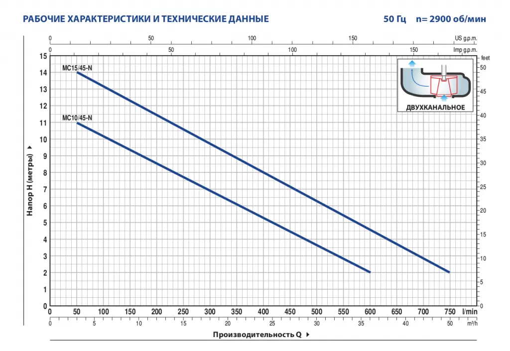 Графические характеристики фекального насоса PEDROLLO MCM 10/45