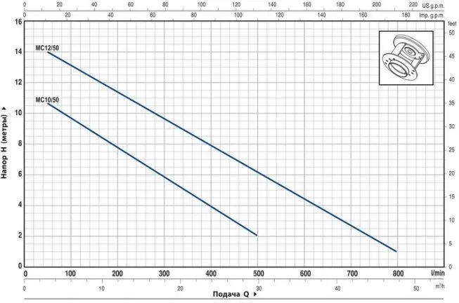 Графические характеристики фекального насоса PEDROLLO MCM 10/50