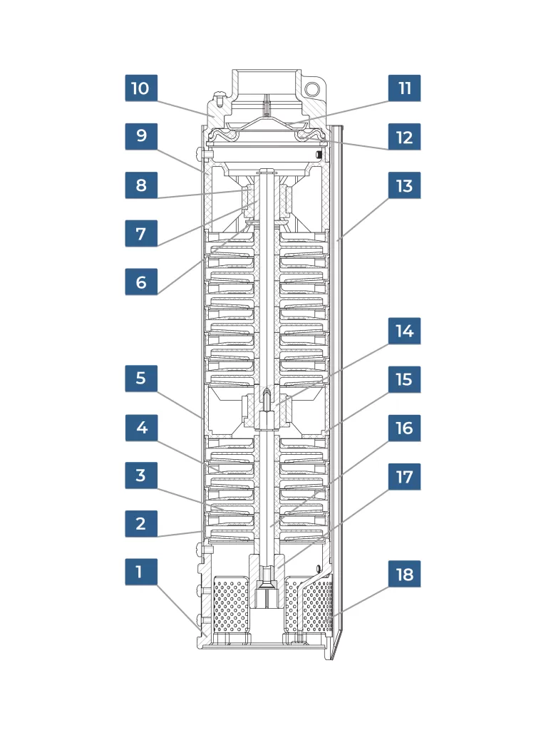 Скважинный насос IRCEM 3BH15S — это высокоэффективный центробежный насос, предназначенный для использования в системах водоснабжения. С мощностью 1500 Вт и максимальным напором до 137 м, он способен обеспечить стабильное водоснабжение для различных объектов, включая частные дома и дачи. Максимальный расход воды составляет 5.5 м³/час, что позволяет эффективно использовать насос для средних и больших объемов воды.