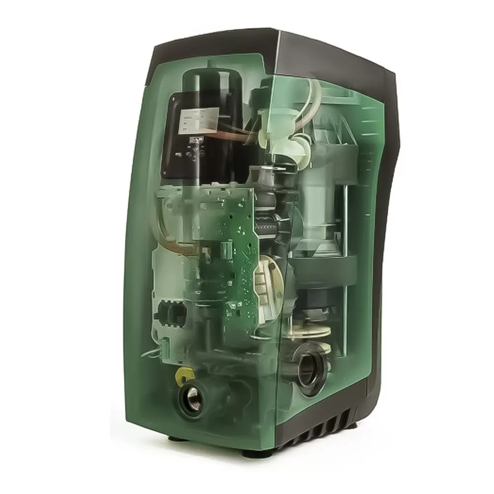Насосная станция DAB E.SYBOX — это комплектная станция водоснабжения с интегрированным в едином блоке насосом и системой управления и регулирования. В комплектацию насосной станции входит: многоступенчатый насос с внутренним водяным охлаждением, система управления на базе электронной платы с преобразователем частоты, расширительный мембранный бак, все внутренние гидравлические соединения. За счет того, что насос спрятан внутри корпуса установки и охлаждается перекачиваемой водой, станция производит очень мало шума. 45 дБ это рекорд для бытовых повысительных установок.