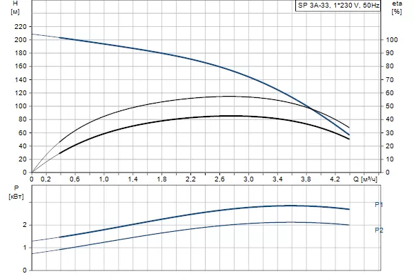 Насос Grundfos SP 3A-33 создан с применением новейших гидравлических технологий. Grundfos SP 3A-33 созданные специально для того, чтобы обеспечивать максимальную эффективность в периоды высокой нагрузки, насос имеет низкую стоимость и высокую надёжность эксплуатации вне зависимости от вида назначения. Grundfos SP 3A-33 обеспечивает высокую эффективность, высокое сопротивление абразивному износу (песку и иным абразивам), защиту от перегрева двигателя и простоту технического обслуживания. Также доступна готовая к применению система контроля и управления, предназначенная для постоянной оптимизации работы насосной системы. Максимальная производительность насоса 4.3 м3/час, максимальный напор 210 м при мощности электродвигателя 2200 Вт. Насос работает от сети 220 в. Гарантийный срок на насос Grundfos SP 3A-33 составляет 2 года.