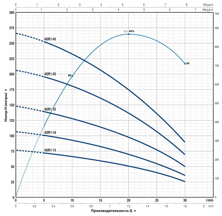 Глубинный насос Pedrollo 4SR1m/13, отличается объективной ценой и надежной работой всех исполнительных механизмов. Насос Pedrollo 4SR1m/13 достаточно простой в эксплуатации и обслуживании, поэтому отлично подходит как для домашнего, так и промышленного применения.В основе работы Pedrollo 4SR1m/13 лежит конструктивно простой, но функционально успешный многоступенчатый центробежный принцип. Электрический двигатель подключается к агрегату через суппорт, в соответствии с нормативами международного стандарта NEMA. Мощность электродвигателя насоса составляет 370 Вт . И при таких показателях мощности насос обладает максимальным напором в 77 метров и максимальной производительностью 1.8 м3/час. Функционирование Pedrollo 4SR1m/13 идентично большинству устройств, основанных на центробежных механизмах подачи воды. Жидкость втягивается в корпус устройства благодаря центробежной силе, создаваемой рабочими колесами, которые также проталкивают воду через все тело насоса "диаметр насоса 4"", а затем в нагнетающий патрубок "диаметр патрубка 1¼"", через который вода и попадает к конечному потребителю. Главной особенностью насоса Pedrollo 4SR1m/13 является малый диаметр корпуса агрегата, а также то, что перекачиваемая вода не касается стенок двигателя. Между жидкостью и корпусом движущей установки располагается прослойка из технологического масла, которая и предотвращает попадание мелких частиц непосредственно в исполнительный механизм. В то время как охлаждение электропривода происходит за счет верхнего способа забора воды, т.е. перекачиваемая жидкость находится всегда выше уровня расположения двигателя. Насос питается от сети в 220 в и комплектуется кабелем 1.5 метров.