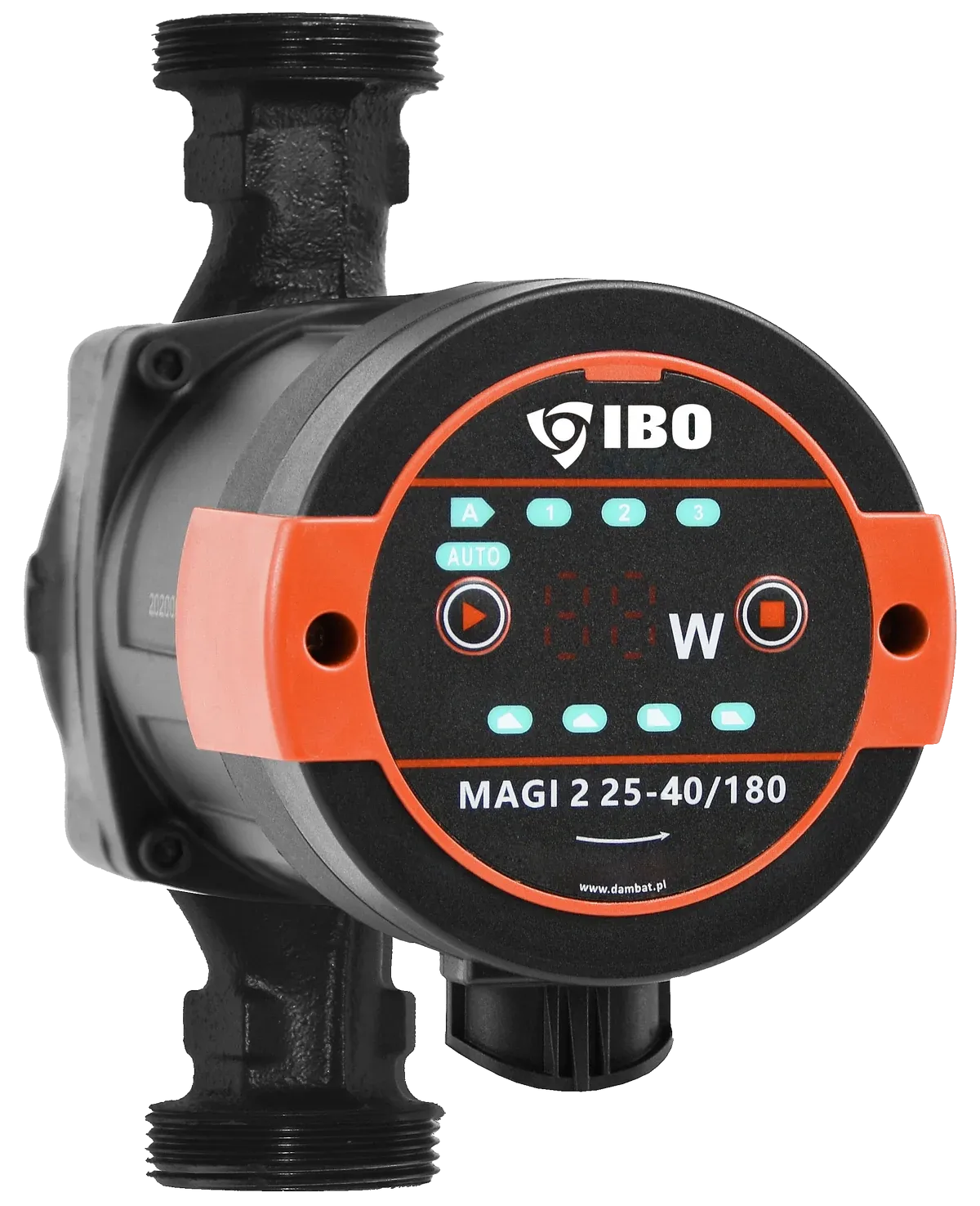 Циркуляционный насос IBO MAGI 2 25-40/180 оснащен магнитным двигателем постоянного тока и регулятором перепада давления, который автоматически регулирует производительность насоса для удовлетворения реальных потребностей системы. Его панель управления размещена сверху двигателя, что облегчает использование и отображает текущее потребление электроэнергии.